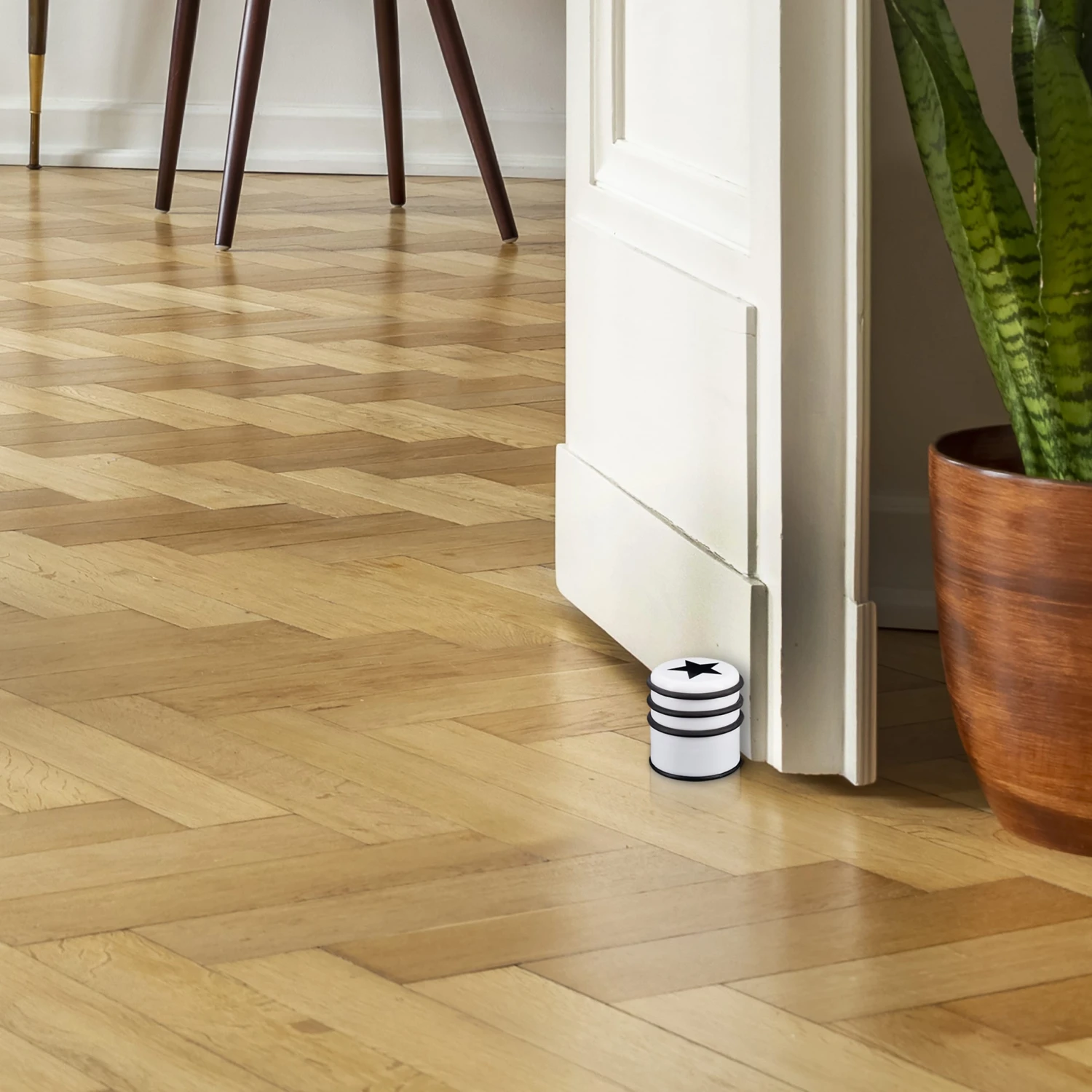 Der Türstopper aus Kunststoff ist der ideale Helfer für zu Hause. Er hindert Fenster und Türen am unbeabsichtigten Zuschlagen durch Zugluft oder Ähnliches. Durch die massive und schwere Fertigung hat der Türpuffer einen festen Stand. Die gummierte Unterseite verhindert das Verrutschen auf glatten Bodenbelägen. Zusätzlich beugen 3 abnehmbare Gummiringe unschönen Abdrücken und Kratzern auf Möbeln, Türen oder Fenstern vor. Zudem ist der Bodentürstopper mit einem coolen Stern versehen, der ihm ein außergewöhnliches Design verleiht.