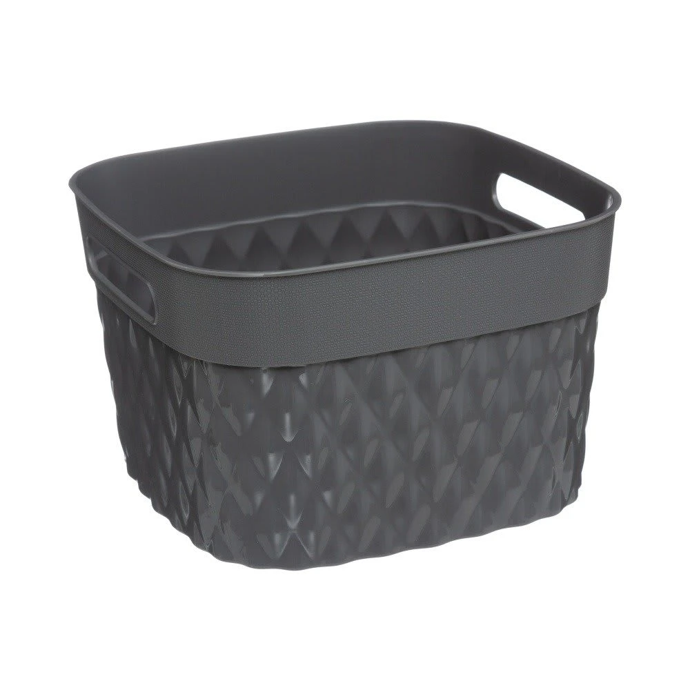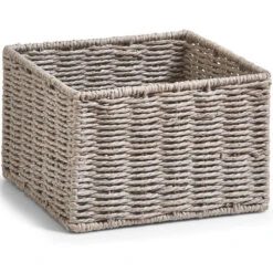 . Es ist eine großartige Lösung für das Badezimmer — Sie können Kosmetika, Handtücher, Hygieneprodukte, Reinigungsmittel, Haartrockner oder Rasierer in die Körbe legen. Darüber hinaus eignet sich der Behälter für Küchenschränke, als Hilfe bei der Organisation von Utensilien oder Gewürzen. Es gibt viele Möglichkeiten! Praktische Seitengriffe erleichtern den Transport des Behälters. Das Material, aus dem der Behälter hergestellt wurde, ist in einem Geflechtmotiv geprägter Kunststoff, der an einen Korb erinnert. Kunststoff ist ein extrem haltbares und langlebiges Material, und für sein Waschen und Reinigen ist trivial.