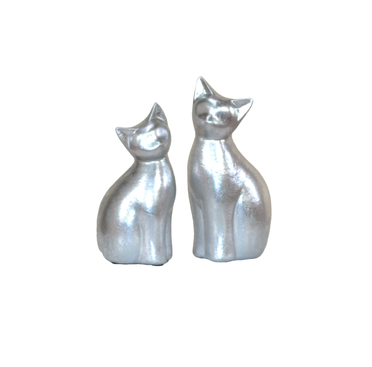 Wunderschönes Katzenpaar aus Kunststein (Polyresin) gefertigt und silberfarben lackiert. Die beiden Kätzchen lassen sich dekorativ im gesamten Wohnbereich kombinieren. Die Maße der Katzen ca.: B. 10 x T. 8 x H. 22 cm und B. 11 x T. 9 x H. 25 cm.