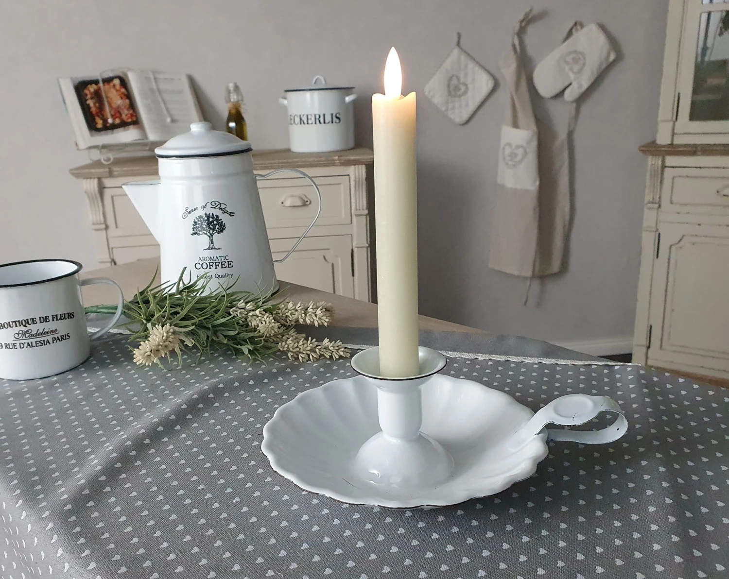 Mit unserem nostalgischen Kerzenständer aus Emaille schaffen Sie ein besonderes Ambiente in Ihrem Zuhause. Ob auf dem Frühstücks- oder Wohnzimmertisch, im Bad oder als Dekoration in Ihrer Landhausküche – er ist ein richtiger Hingucker.
