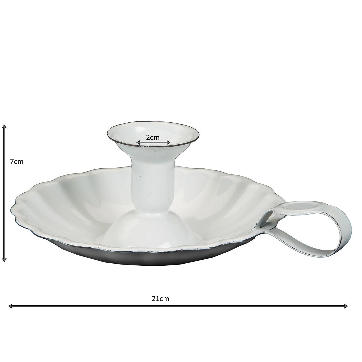 Der schöne Kerzenhalter ist klassisch mit der für Emaille typischen feinen, schwarzen Linie an den Rändern versehen. Er ist passend für eine ca 2 cm konische Kerze. Komplett mit Tropfschale zum Auffangen des Wachses und einem Schlaufgriff zum Tragen.