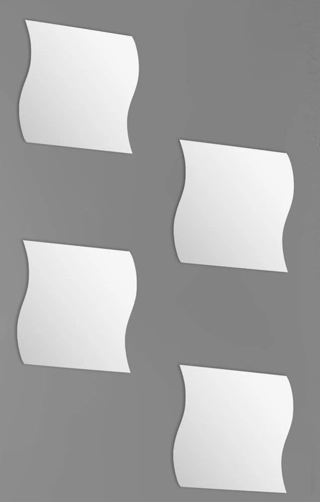 Spiegel sind nicht nur praktische nützliche Gegenstände, sondern auch sehr anmutige Wanddekorationen, die den Raum optisch erweitern und den Stil jedes Interieurs ergänzen. Moderne Spiegel für die Wand sind in der Regel Spiegel ohne Rahmen, ohne Verzierungen, basierend auf geometrischen Formen. Solch ein dekorativer Spiegel von einfacher Form sieht in einer größeren Komposition sehr beeindruckend aus, die zum Beispiel aus mehreren Spiegeln besteht. So bieten Designer uns immer häufiger eine solche Formel an: eine Reihe von Spiegeln für die Selbstmontage, mit der Sie Ihre eigenen Formen an der Wand oder Tür erstellen können. Ein welliger Spiegel ohne Rahmen funktioniert in jedem Raum als Ornament. Sie können es zu einem Spiegel für den Flur, einem Badezimmerspiegel machen oder mit einer Wand im Schlafzimmer dekorieren. Adhesive Spiegel sind auch bequem zu installieren und geniale Lösung, die auf schnelle Weise den dekorierten Raum vollständig verwandeln kann. Das Set besteht aus vier gewellten Spiegeln gleicher Abmessungen. Produk