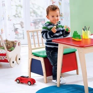 “Made in Germany”, super Qualität, extrem stabil und langlebig! Mit abgerundeten Ecken und Kanten. Stabiles Sitzmöbel und zuverlässiger Ordnungshüter in einem. Die Deckelbremse schützt vor eingeklemmten Fingern. Inkl. Aufbauanleitung. Rahmen/Rückenlehne Die bunte Truhenbank von Geuther ist Sitzmöbel, Aufbewahrung und Blickfang in einem. Mit diesem Multitalent macht sogar das Aufräumen Spaß. Lieferumfang: stabile Truhenbank, Montagematerial, Aufbauanleitung Material: Rahmen und Rückenlehne aus Rotbuche, Sitzfläche und Seitenteile aus MDF lackiert Verwendung: als Sitzplatz und zur praktischen Aufbewahrung Die vielseitige Bank macht in jedem Kinderzimmer eine gute Figur. Mit 23 Zentimeter Sitzhöhe ist sie ein ideales Sitzmöbel für die Kleinen. Doch ihre wahren Stärken liegen im Inneren: Unter der Sitzfläche verbirgt sich ein geräumiges Staufach, in dem Bauklötze, Brettspiele und Mal-Sachen im Nu verschwinden. Die Deckelbremse sorgt dafür, dass Fingerchen nicht eingeklemmt werden. Abgerundete Kanten schützen vor blauen Flecken, wenn es mal etwas wilder zugeht. Material: Rotbuche (Fagus sylvatica) Herkunftsland Deutschland Sitzfläche Material: lackierte mitteldichte Faserplatte Truhenbank Maße (BxTxH): 59 x 35 x 60 cm Sitzhöhe: 32 cm Stauraum Maße (BxTxH): 50 x 30 x 20 cm