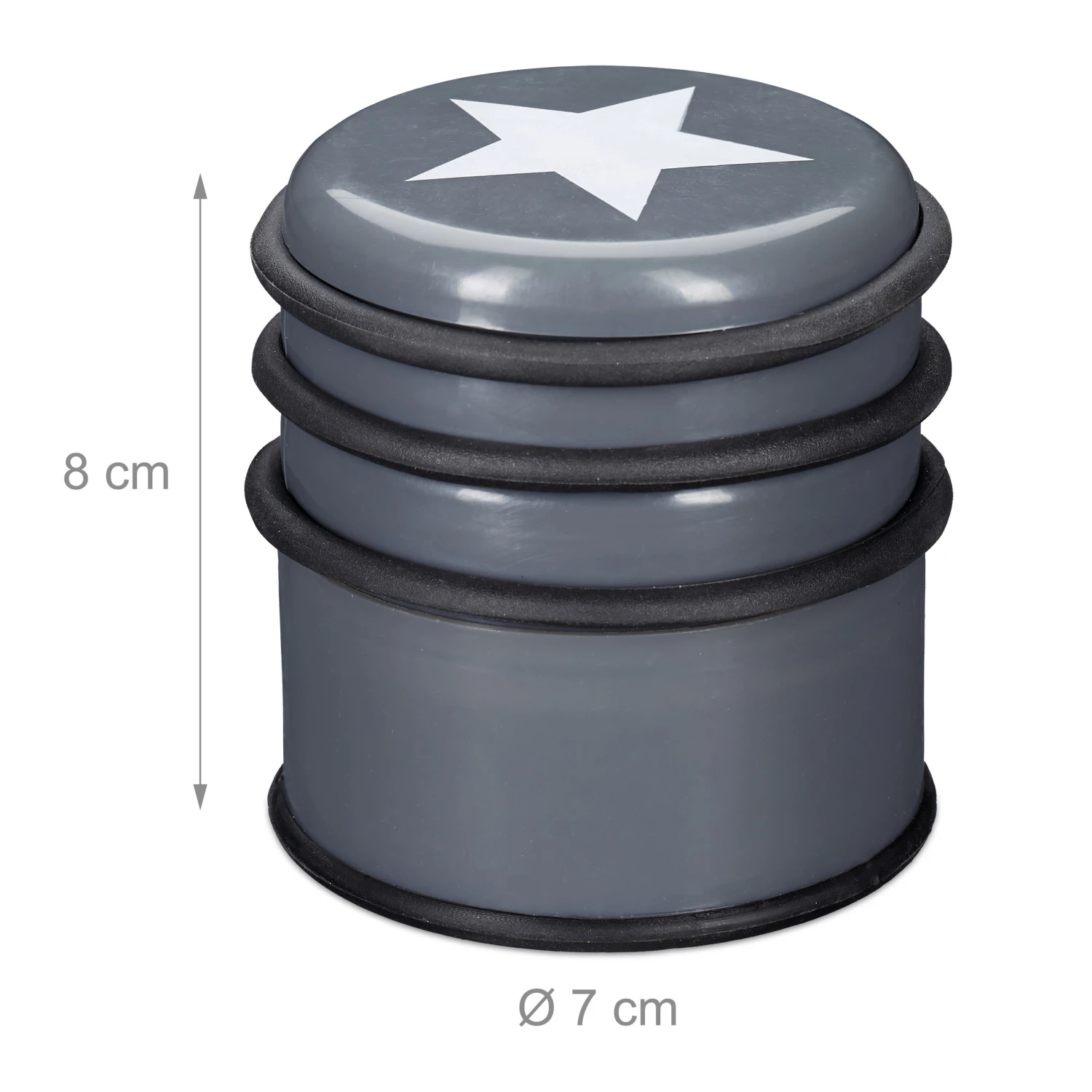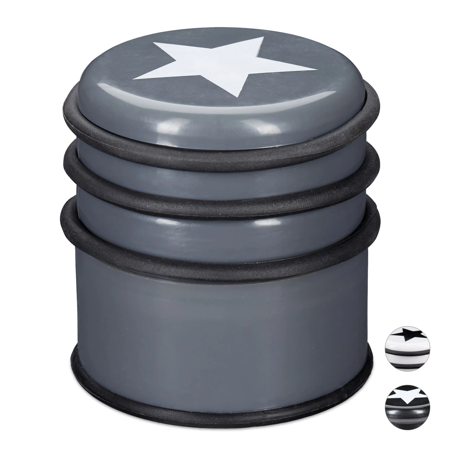 Der Türstopper aus Kunststoff ist der ideale Helfer für zu Hause. Er hindert Fenster und Türen am unbeabsichtigten Zuschlagen durch Zugluft oder Ähnliches. Durch die massive und schwere Fertigung hat der Türpuffer einen festen Stand. Die gummierte Unterseite verhindert das Verrutschen auf glatten Bodenbelägen. Zusätzlich beugen 3 abnehmbare Gummiringe unschönen Abdrücken und Kratzern auf Möbeln, Türen oder Fenstern vor. Zudem ist der Bodentürstopper mit einem coolen Stern versehen, der ihm ein außergewöhnliches Design verleiht.