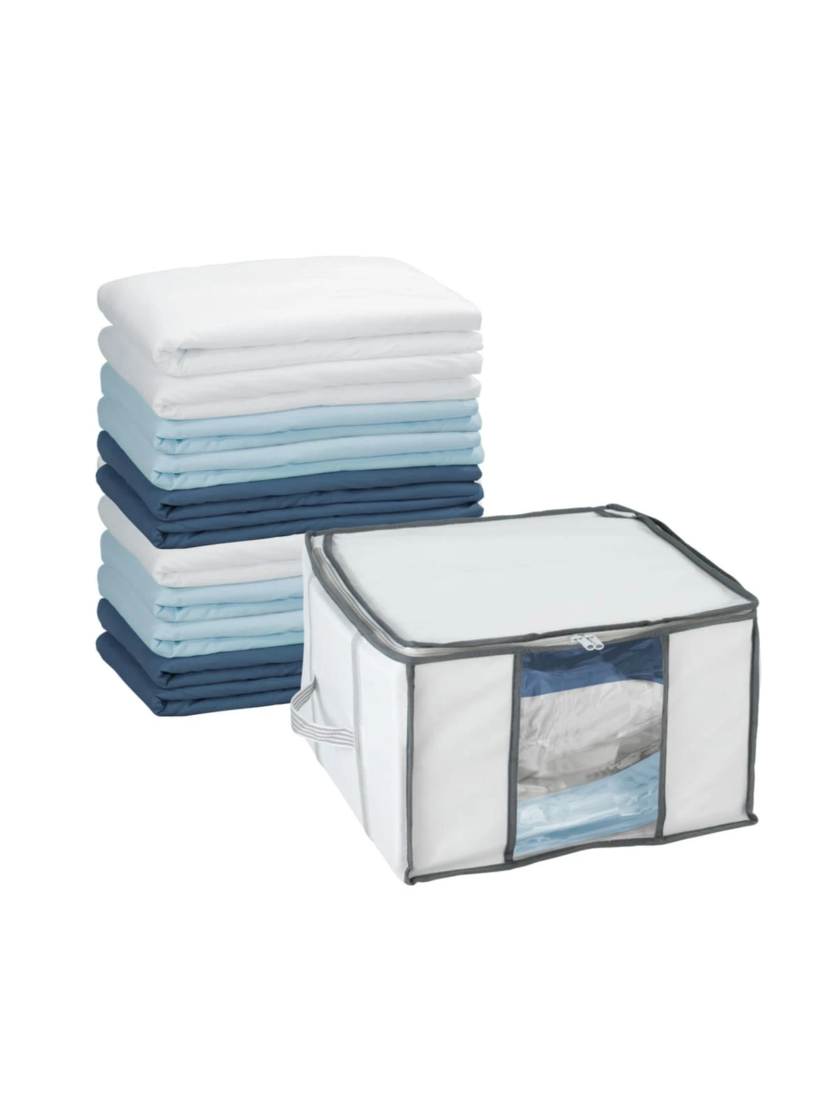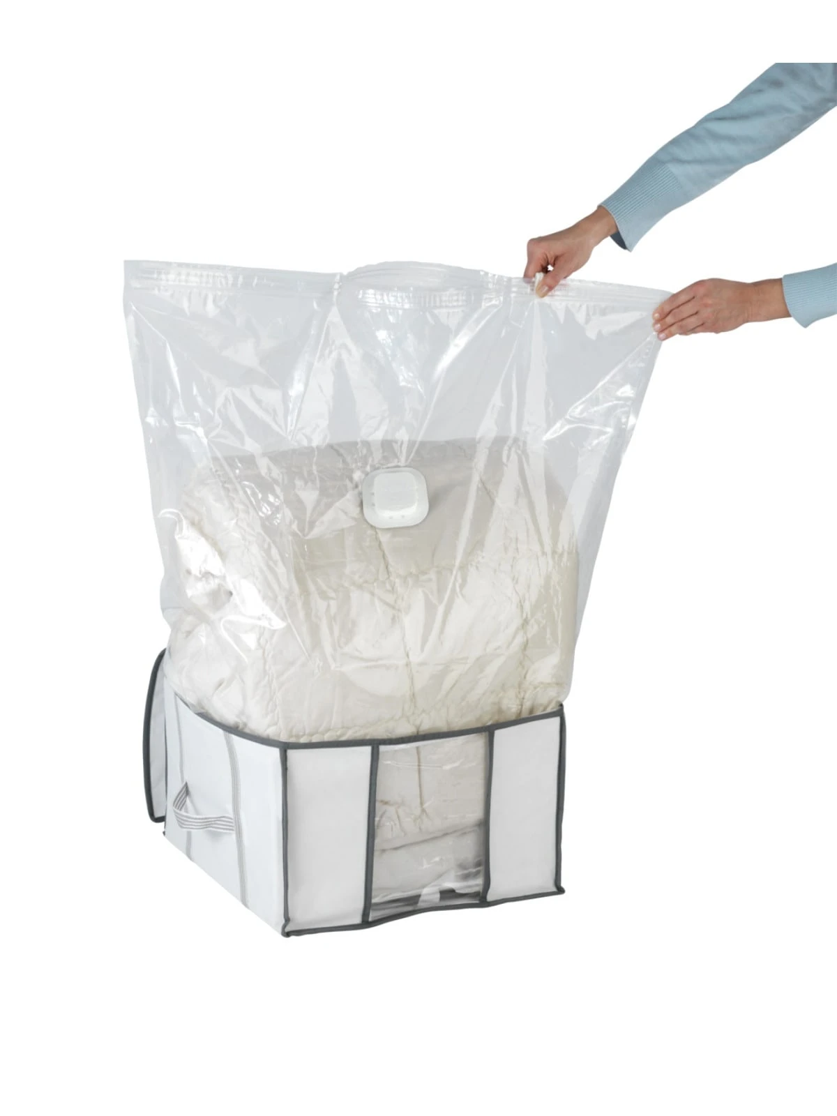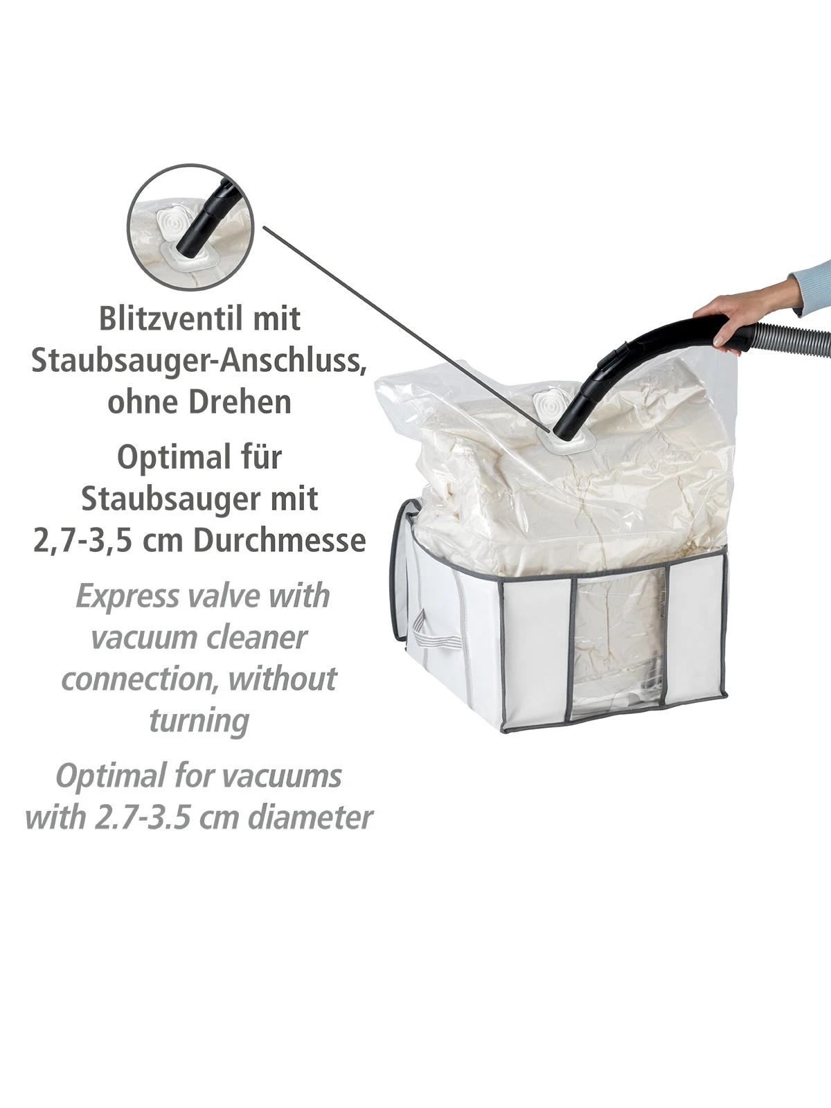 Platzsparen und luftdichtes Verstauen in Einem bietet die Vakuum Soft Box S. In der Box befindet sich eine integrierte Vakuum-Tasche (90 x 90 x 40 cm) mit Blitz-Ventil, welche nach dem Befüllen einfach durch Absaugen geschlossen werden kann. Das Luftventil verhindert das Eindringen von Luft und sorgt somit für langanhaltenden Schutz. Mit der Vakuum Soft Box S kann eine Platzersparnis von bis zu 75 % erzielt werden. Bei Bedarf einfach die Box öffnen und schon sind die Kleidungsstücke wieder verfügbar.