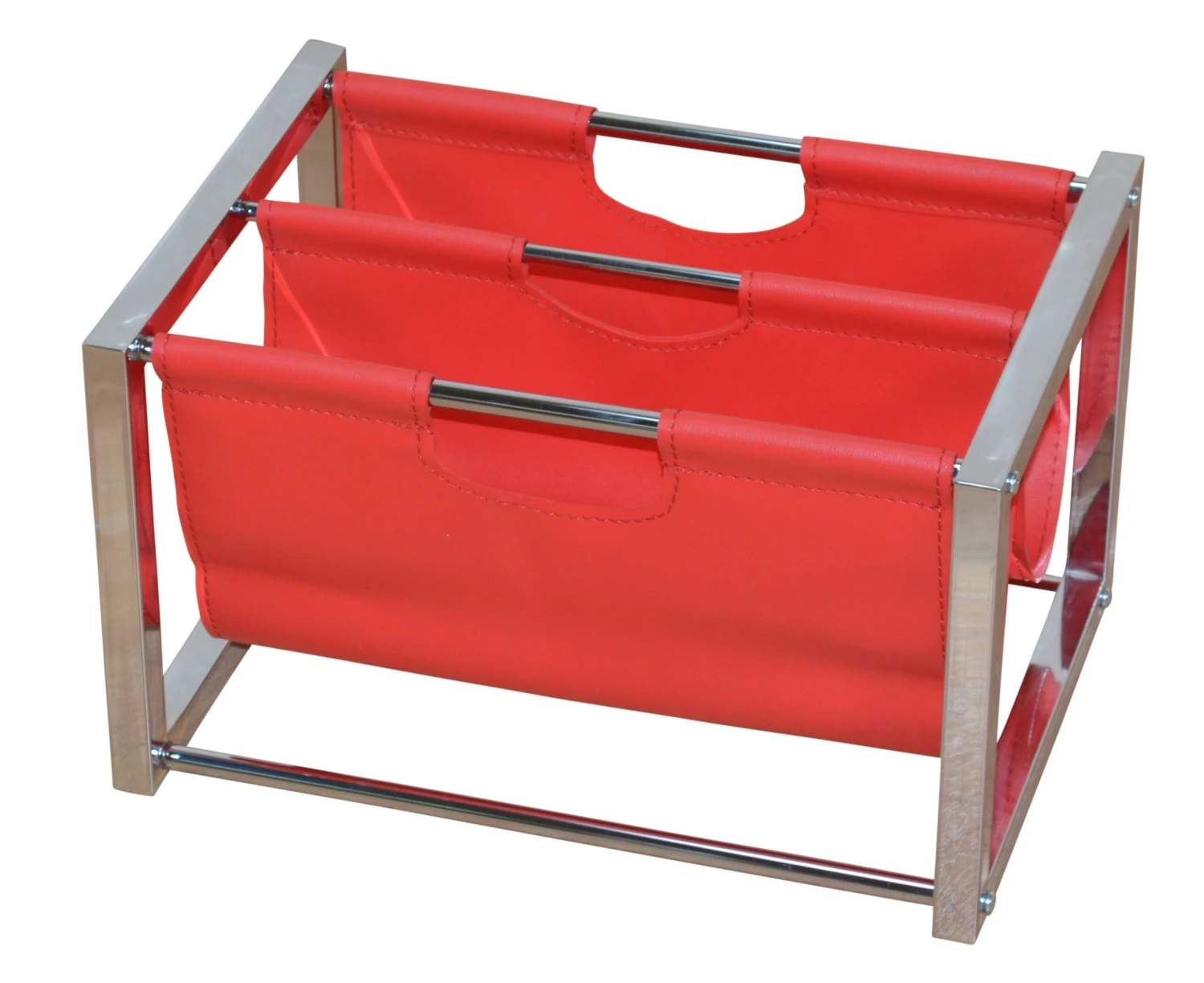 Professioneller, moderner Zeitungshalter mit 2 Halterungen aus Kunstleder (100% Polyvinylchlorid), rot, in dem übersichtlich viele Magazine, Kataloge gesammelt werden können. Stabiles Gestell aus Vierkantstahl, verchromt. Mit praktischen, eingearbeiteten Griffen. Artikel wird zerlegt, mit Aufbauanleitung angeliefert.